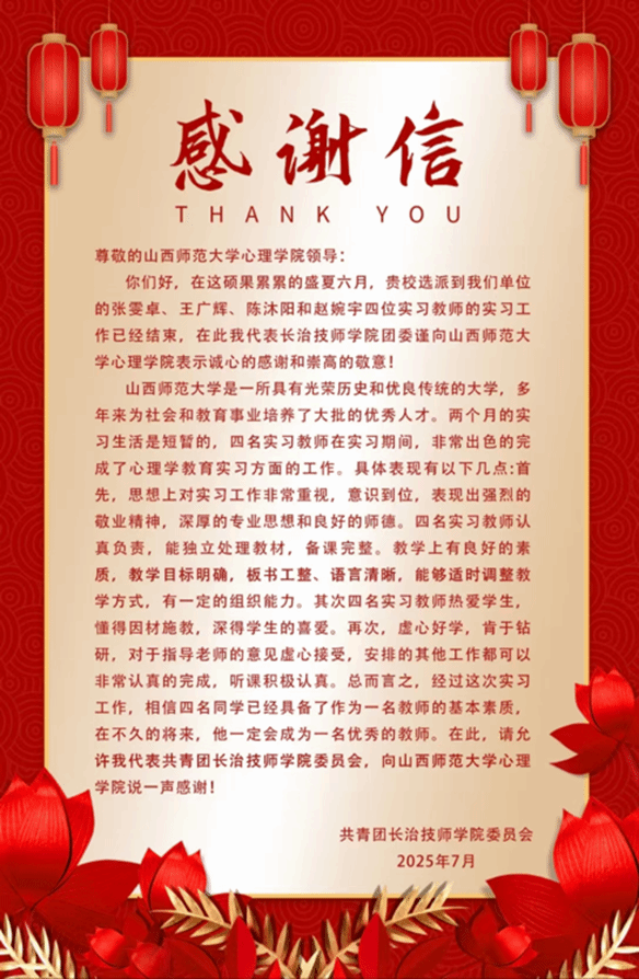 2025年7月,公司接连收到长治技师学院团委与太原市第十六中学校的实习感谢信。信中不仅对心理学专业实习生在实习期间展现出的扎实专业素养、严谨敬业精神及出色实践能力给予高度评价,更对公司人才培养模式和实践教学质量表达了认可。这两封感谢信既是对实习生们辛勤付出的肯定,也成为公司在 “启智润心” 心理育人道路上取得成效的生动体现,为高校与实习单位的长效合作奠定了坚实基础。