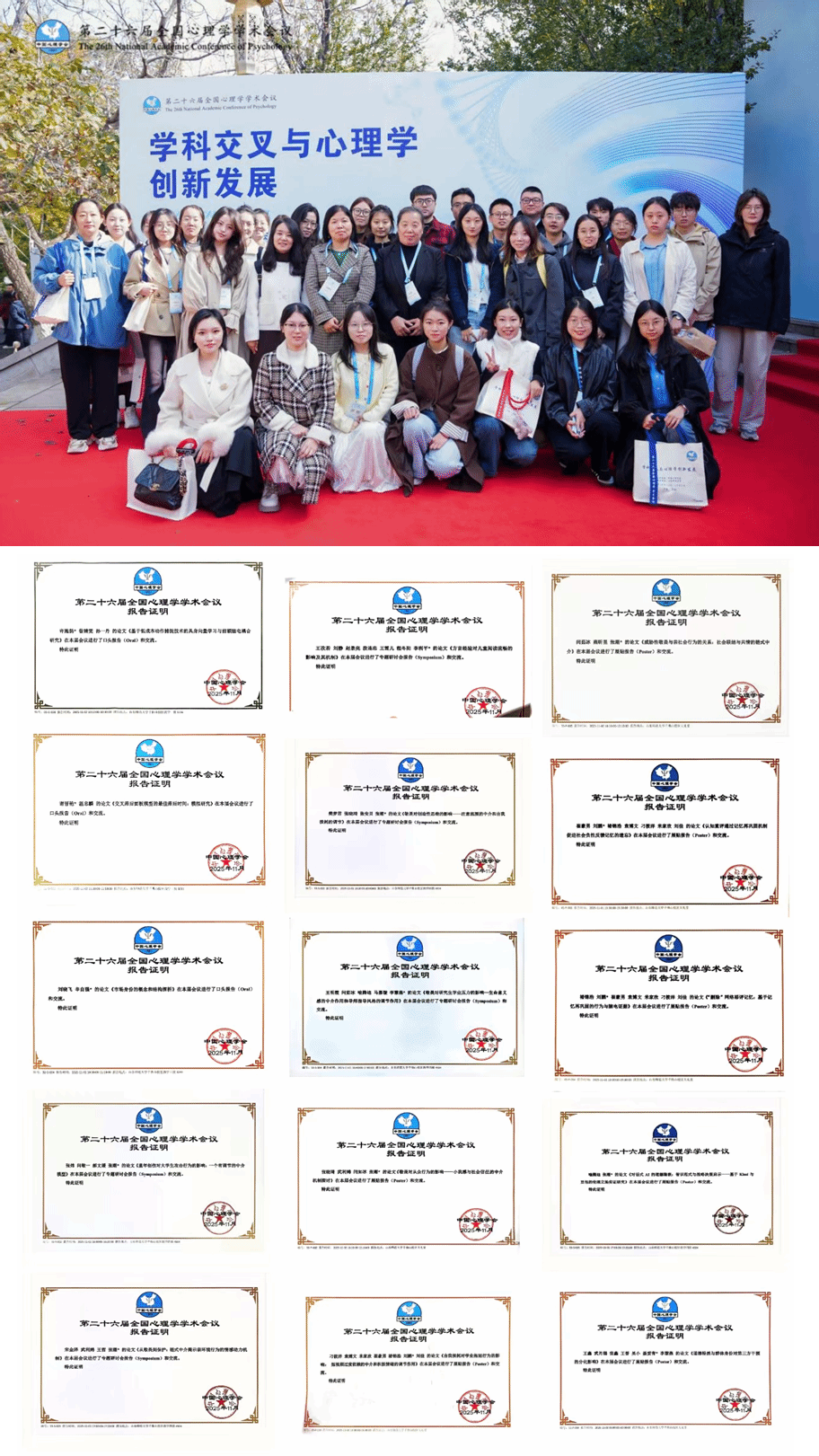 11月1日,第二十六届全国心理学会议在山东济南隆重召开。本次大会以“学科交叉与心理学创新发展”为主题,汇聚了来自全国各地3000余名心理学界专家学者。公司师生代表全程参会,积极融入学术交流,认真聆听高水平主旨报告与专题汇报,并结合自身研究方向参与了多个分论坛的研讨活动。