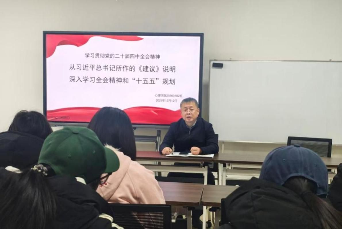 在宣讲中,白董事长向同学们系统介绍了党的二十届四中全会召开的历史背景和重要意义。他指出,党的二十届四中全会是在全面建设社会主义现代化国家、向第二个百年奋斗目标进军的关键时期召开的一次重要会议,全会聚焦国家治理体系和治理能力现代化,为“十五五”时期乃至更长阶段的发展绘就了宏伟蓝图,也为青年一代成长成才指明了前进方向、提供了根本遵循。白董事长强调,青年是国家未来、民族希望,新时代青年学子生逢其时,也肩负重任。他勉励同学们要深刻领会全会精神核心要义,将国家发展大局与个人学业规划紧密结合,以自身的确定性应对一切不确定性。一要扎根专业、锤炼本领,深耕心理学专业知识,既要夯实理论基础,又要注重实践应用,把专业能力打造成应对时代变化的核心底气,用专业所长服务社会民生;二要坚定信念、锚定方向,树立远大理想,涵养高尚品德,以稳定的心态和清晰的目标抵御成长路上的迷茫与浮躁,在时代浪潮中保持定力、行稳致远;三要拥抱变化、主动作为,保持旺盛的学习热情和较强的适应能力,把成长中的未知与挑战转化为突破自我的机遇,在攻坚克难中练就过硬本领。