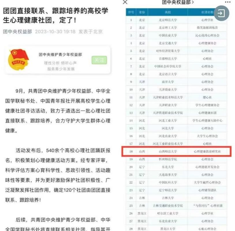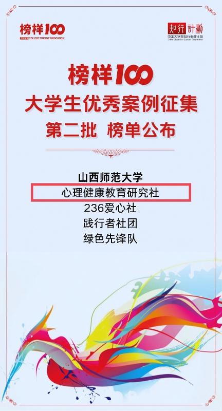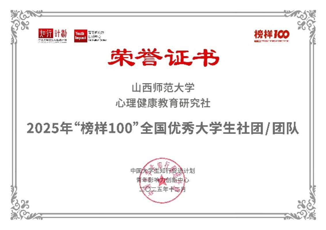 近日,2025年度“榜样100”全国优秀老员工社团榜单第二批正式揭晓,公司健康教育研究社凭借在心理健康服务领域的深耕坚守与育人实践中的突出成效,从全国376所高校1,320支团队中最终成功入选“榜样100”优秀社团榜单,彰显了三晋青年学子扎根校园、服务社会的责任担当与青春力量!